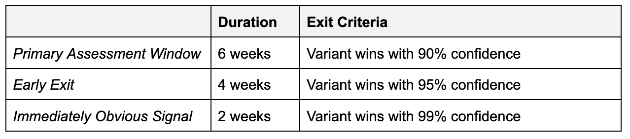 For our test, I worked with our data scientist to define “exit” criteria or definitions based on our test volume for when we could call a winner: