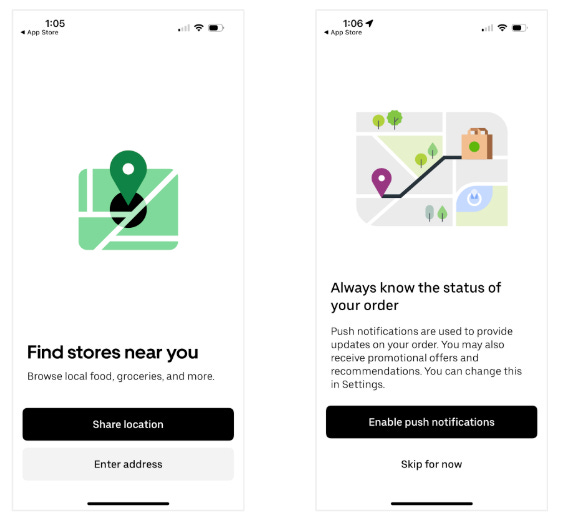Ask for permissions at the right time. Location makes sense upfront, but push notifications would be better received after a first order—when users are actively tracking their food.