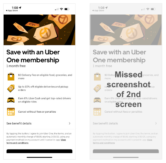 Next up was their subscription play. I was shown the Uber One membership option screen. I get this, membership at this point might be enticing for a first time customer - the savings are real. From Uber’s perspective it is probably one of the highest conversion placements. A few aspects of the screen itself surprised me, however: