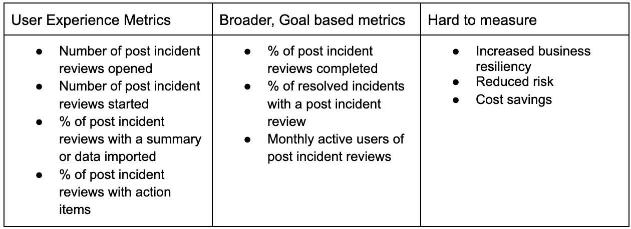 Thinking deeper about our customers we also know that the result of a successful post incident review process leads to metrics that include: