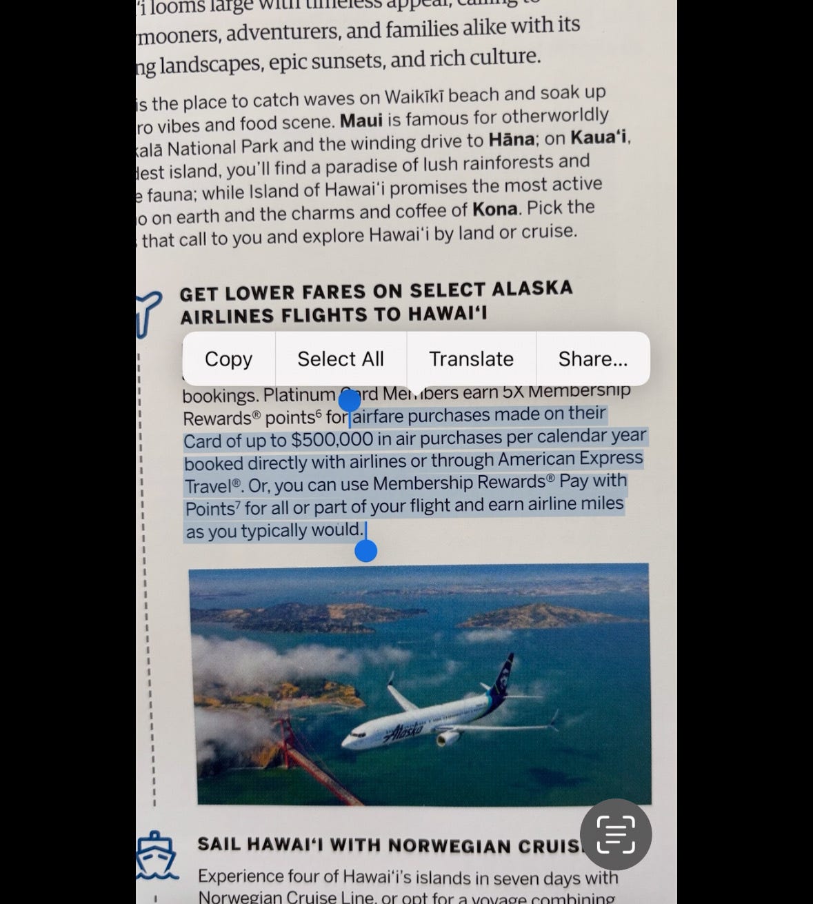 Yesterday is a perfect example. The mail arrived with a thick AmEx brochure about our credit card benefits. I scanned it to see if there was anything we didn’t already know and there was - apparently our card allows us to pay with points on Alaska Airlines - cool! I knew snapping a full (or zoomed in) photo of the brochure would lose my wife (WTF did he send me this?) so I snapped the photo, scanned the text and sent her just the sentences she needed to see (demo below).