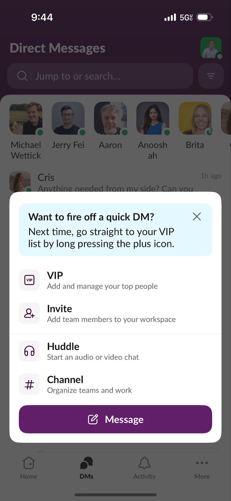 In contrast, Slack uses a discreet contextual promotion to let me know about a new feature. In this journey, I was already on the DM tab of the app and had pressed the “plus” icon. This modal popped with options of actions I could take, with the largest CTA to draft a message.