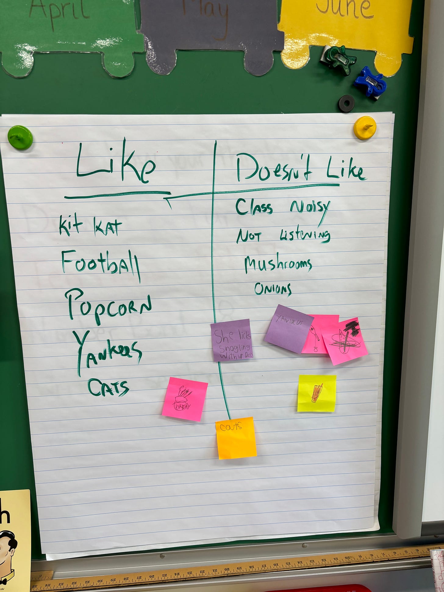 To warm us up and help the kids build empathy I began by asking them to identify things that their teacher likes and doesn’t like. “The Yankees!”, “Kit Kats”, “Popcorn!” and other notes all came out. I made a list of those “likes” and “don’t likes” on the board.