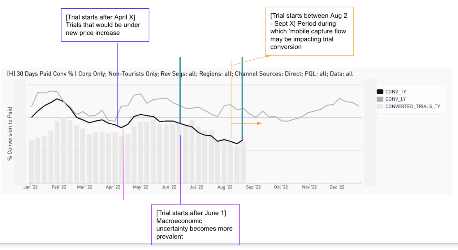 I joined the PagerDuty Growth team in September 2022 and our north star metric (Note: see last week’s post on Finding Your North Star) was 30 day conversion rate (the % of customers who started a free trial 30 days ago that converted to paid accounts). Soon after I joined my manager presented me with a problem - conversion rates had been declining for the last 3 months and we needed to figure out why.