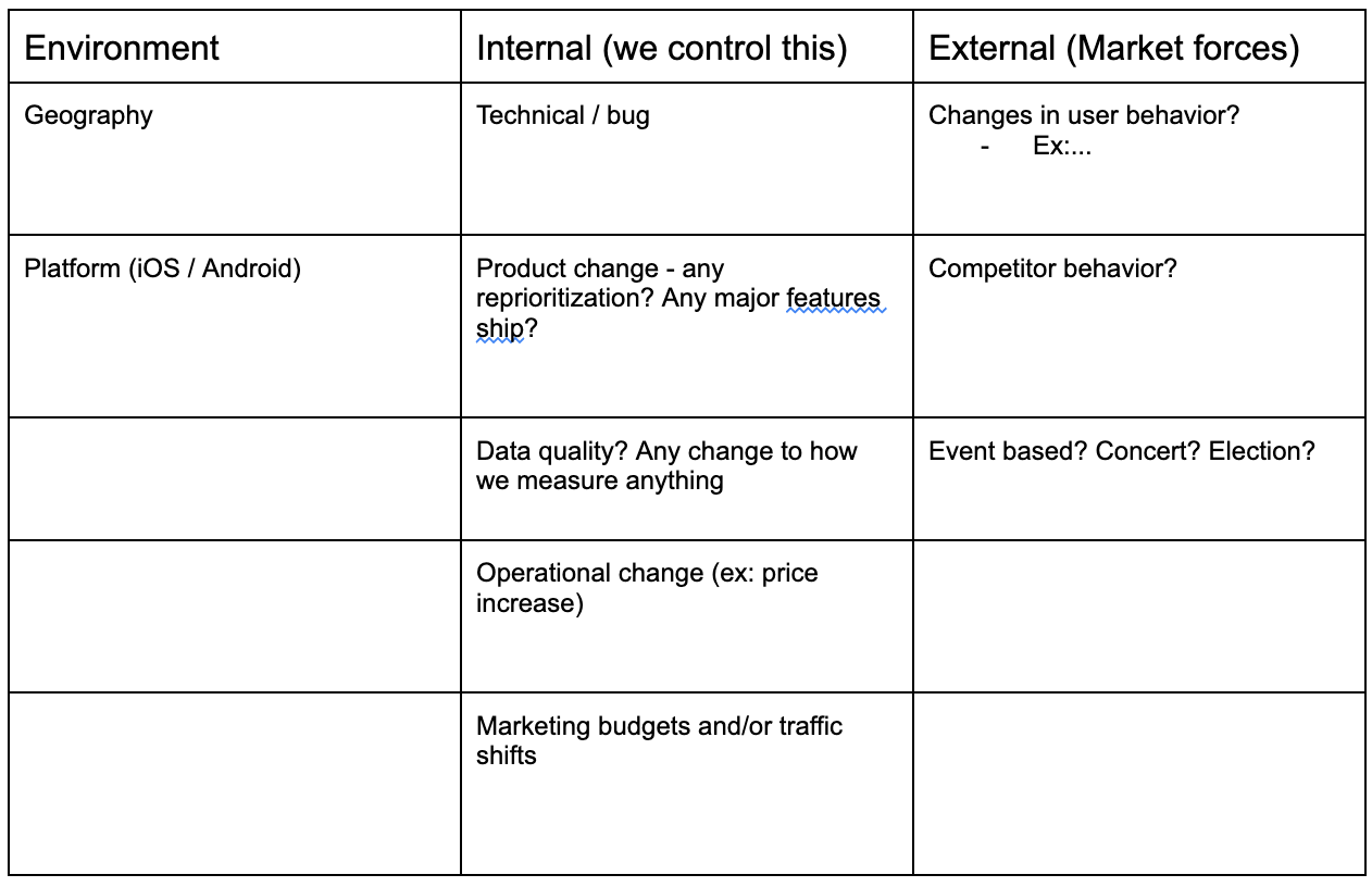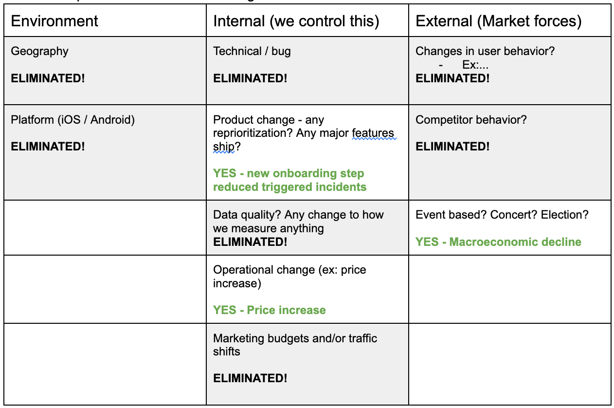 In the case of the conversion decline I began working through the questions, starting with the Environment category. Here I discovered that the free trial was predominantly used on web and was not available in PagerDuty’s mobile app and infrequently accessed via mobile web. In terms of Geography, I discovered that the decline is global and was not isolated to a specific geography. Environmental category eliminated.