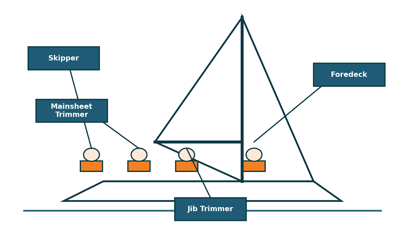 Like a product team, each crew member has a specialized role — the skipper steers, the main trimmer controls the big sail, the jib trimmer fine-tunes the front sail, and the bow crew (me) handles everything up front to keep the boat moving fast.
